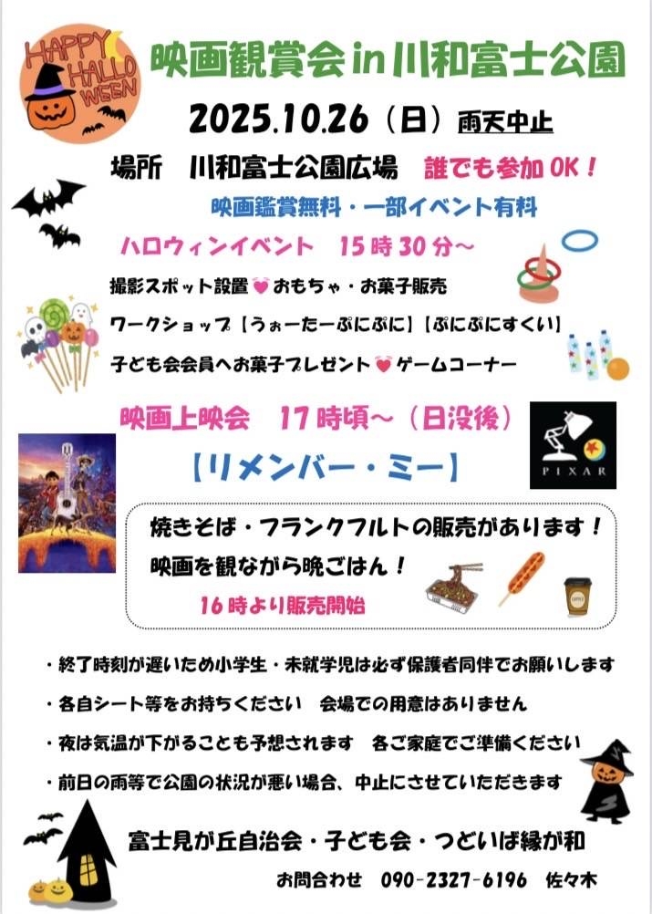 富士見が丘自治会・つどいば縁が和の方達ご協力のもと、いつも遊んでいる公園に大きなスクリーンが登場します。大画面で一緒に映画を観ましょう!